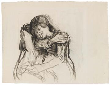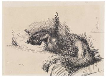 Käthe Kollwitz, Lise auf einem Sofa schlafend, um 1890, Feder in Tusche auf weißem Zeichenkarton, NT 22