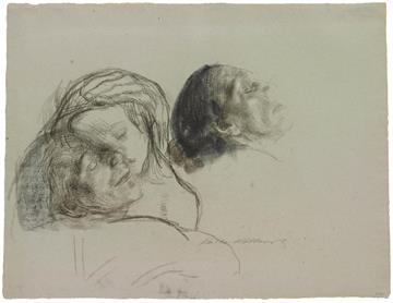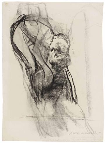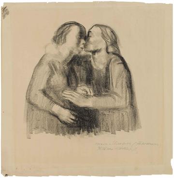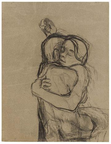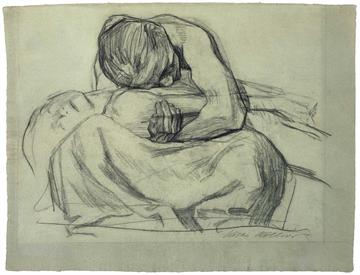 Käthe Kollwitz, Umschlungene, um 1909/10, Kohlezeichnung teils gewischt, auf gelblichem Bütten, NT (559a)