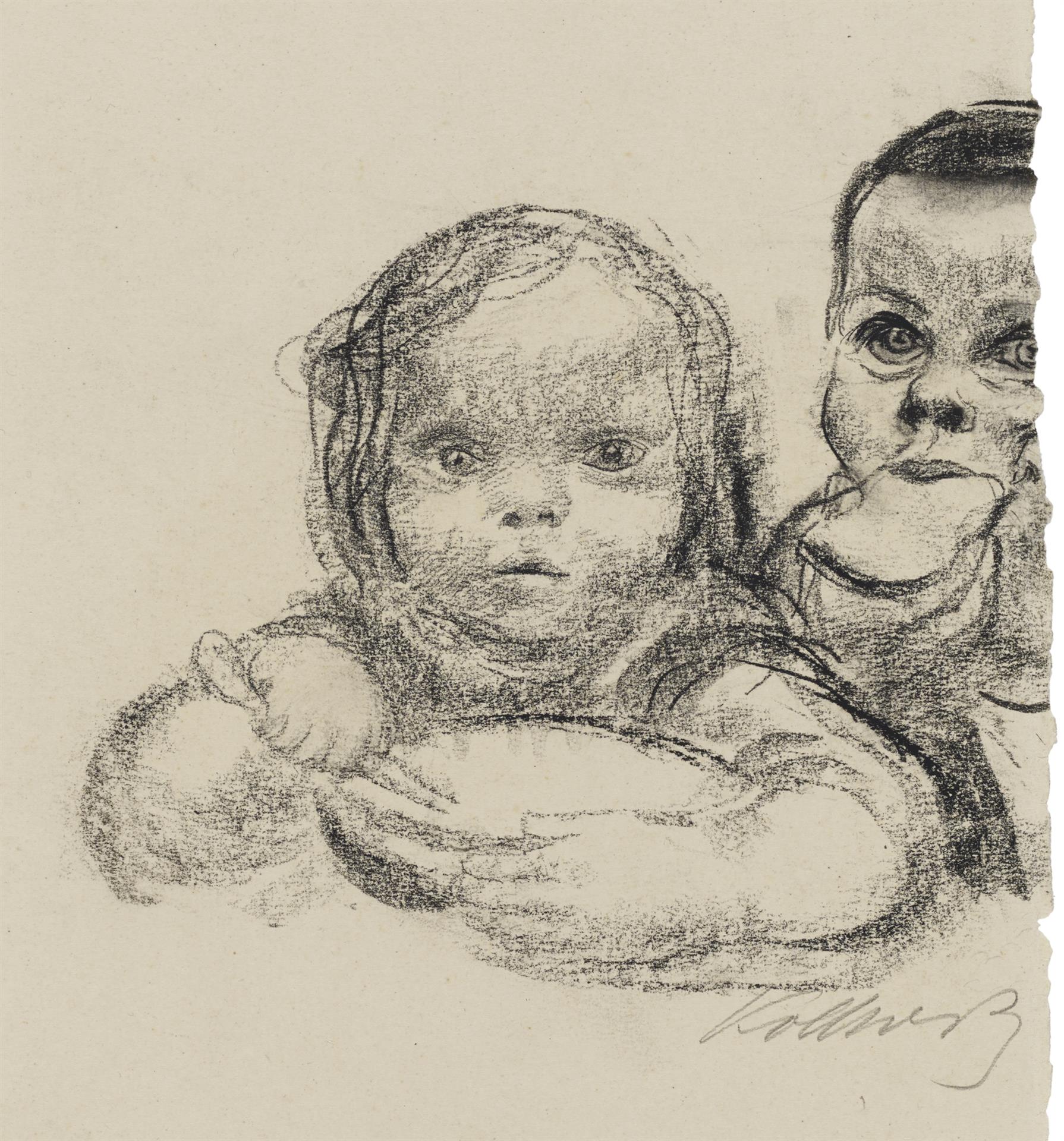 Käthe Kollwitz, Zwei Kinder beim Essen, um 1927/28, Kreide und Kohlezeichnung auf kartonstarkem Velin, NT (1149a)